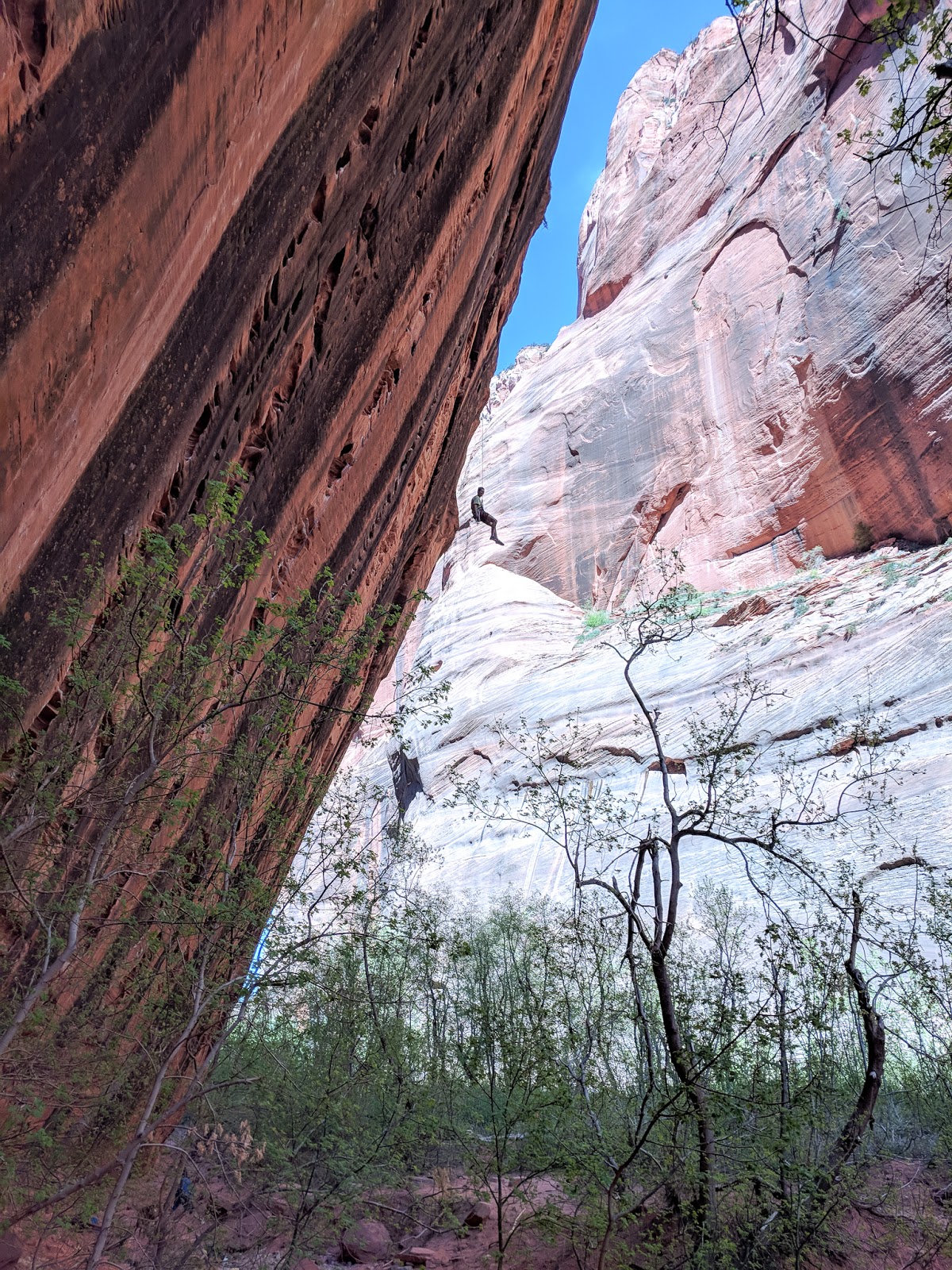 After I dropped Christian off at the airport I drove back north to Zion National Park to meet my friend Corey. The next day we climbed some routes in the park: a 3-pitch trad 5.10 and a 2-pitch sport 5.11. They were both stellar climbs! Here's a shot of the sport route. It follows the arete between the dark and light colored rock. The climbing and the views were both spectacular.